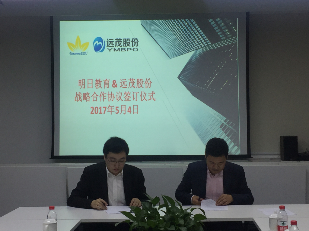 2017年5月4日,明日教育与远茂股份(839551)相关负责人举行了会谈,明日教育董事长门门,董事、行政与人力资源总监兼企业培训部负责人金莉萍,远茂股份董事长王建波,副总经理兼董秘韩军,副总经理徐立喜出席会议。双方对职业教育培训、国际教育培训进行了深入的交流,并达成一致合作意向,首批职业技能培训工作将尽快开展。会后明日教育与远茂股份(839551)及其控股股东易盟集团签订了战略合作协议。